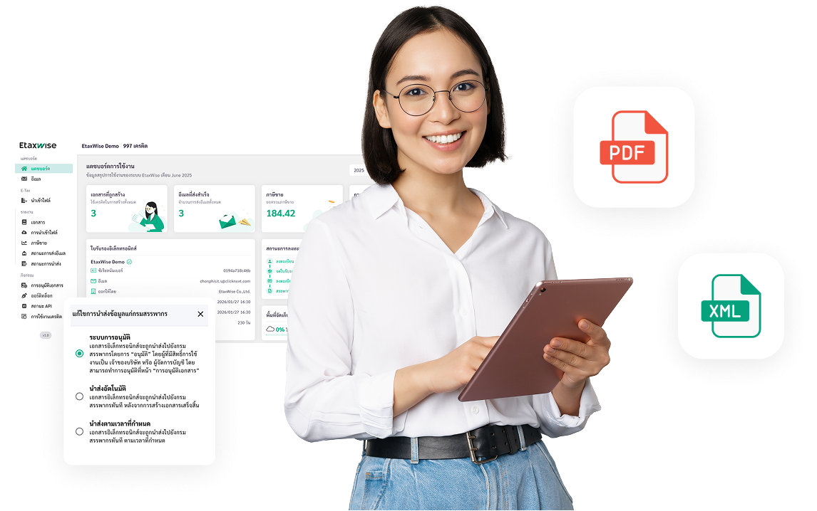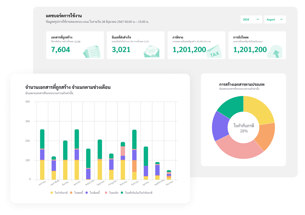 • สรุปข้อมูลการใช้งาน เช่น จำนวนเอกสาร ภาษีที่ส่ง
